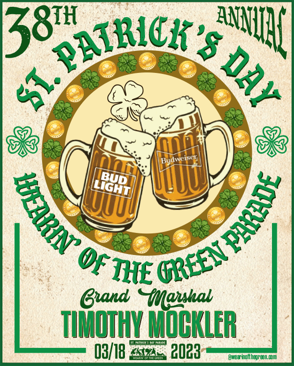 Celebrate with us! 2023 Wearin' of the Green St. Patrick's Day print. Features beer mugs (Budweiser & Bud Light) in honor of our Grand Marshal, Tim Mockler. Created by Courtney Morgan. *Unsigned.